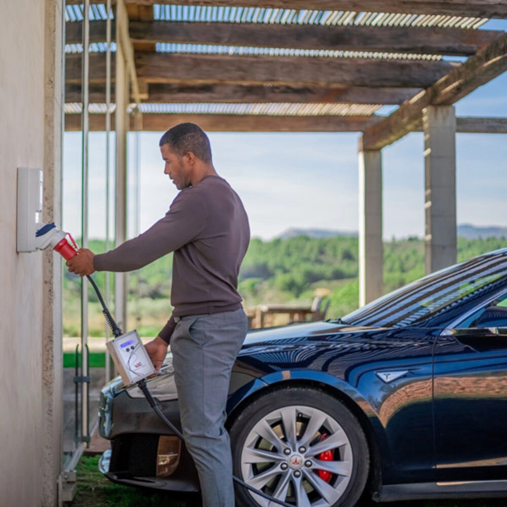 EV Portable es el cargador portátil por excelencia. Pequeño y ligero, EV Portable carga tu coche eléctrico en cualquier lugar. Adaptable con múltiples accesorios para la conexión de alimentación. Toma de salida manguera Tipo 2 de 5 metros.